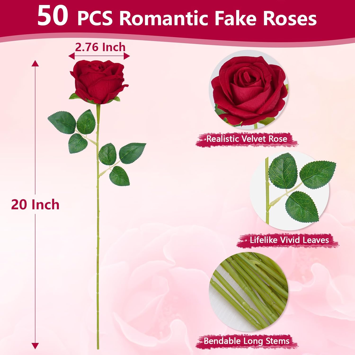 BLEUM CADE 50 Pcs Red Roses Artificial Flowers, Real Touch Velvet Roses Fake Flowers Bulk, Artificial Roses Bouquet with Long Stems Bridal DIY Wedding Party Centerpiece Decorations