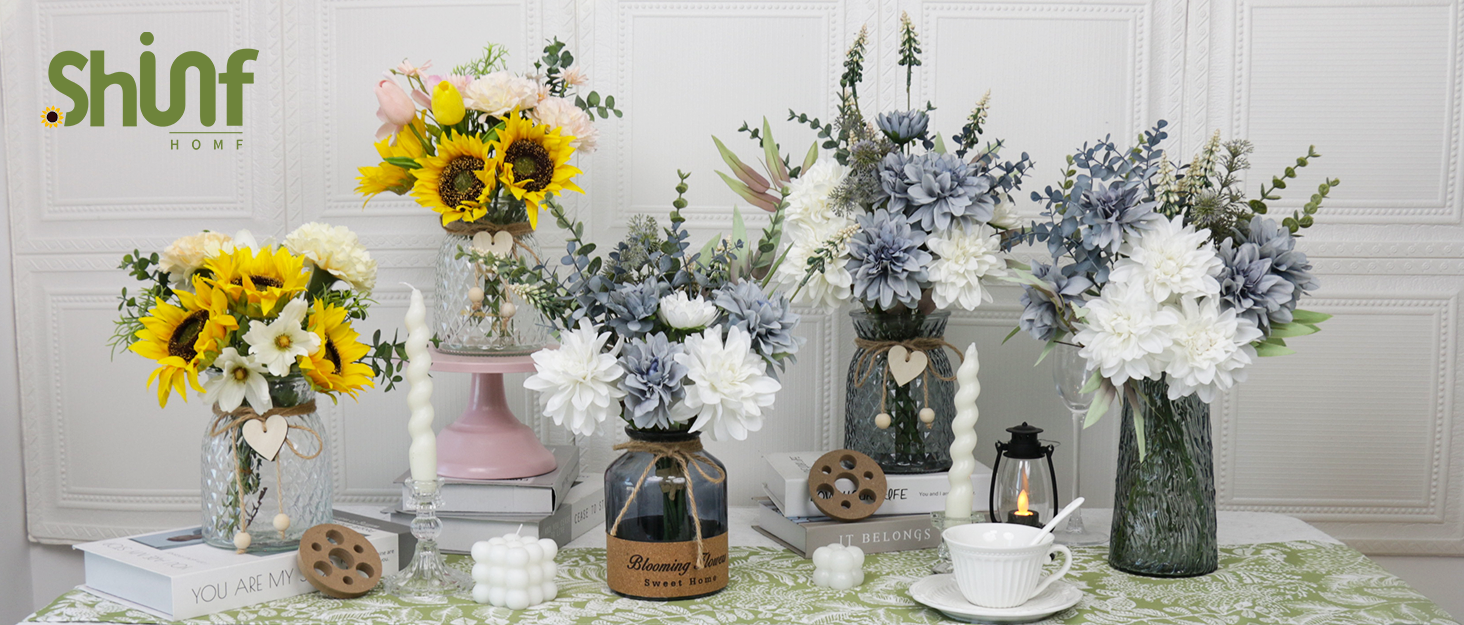 Fake Flowers in Vase,8 Dahlias,Silk Artificial Flowers in Vase,Centerpiece Table Decorations,Faux Flowers in Vase with a Flower Arrangement Holder